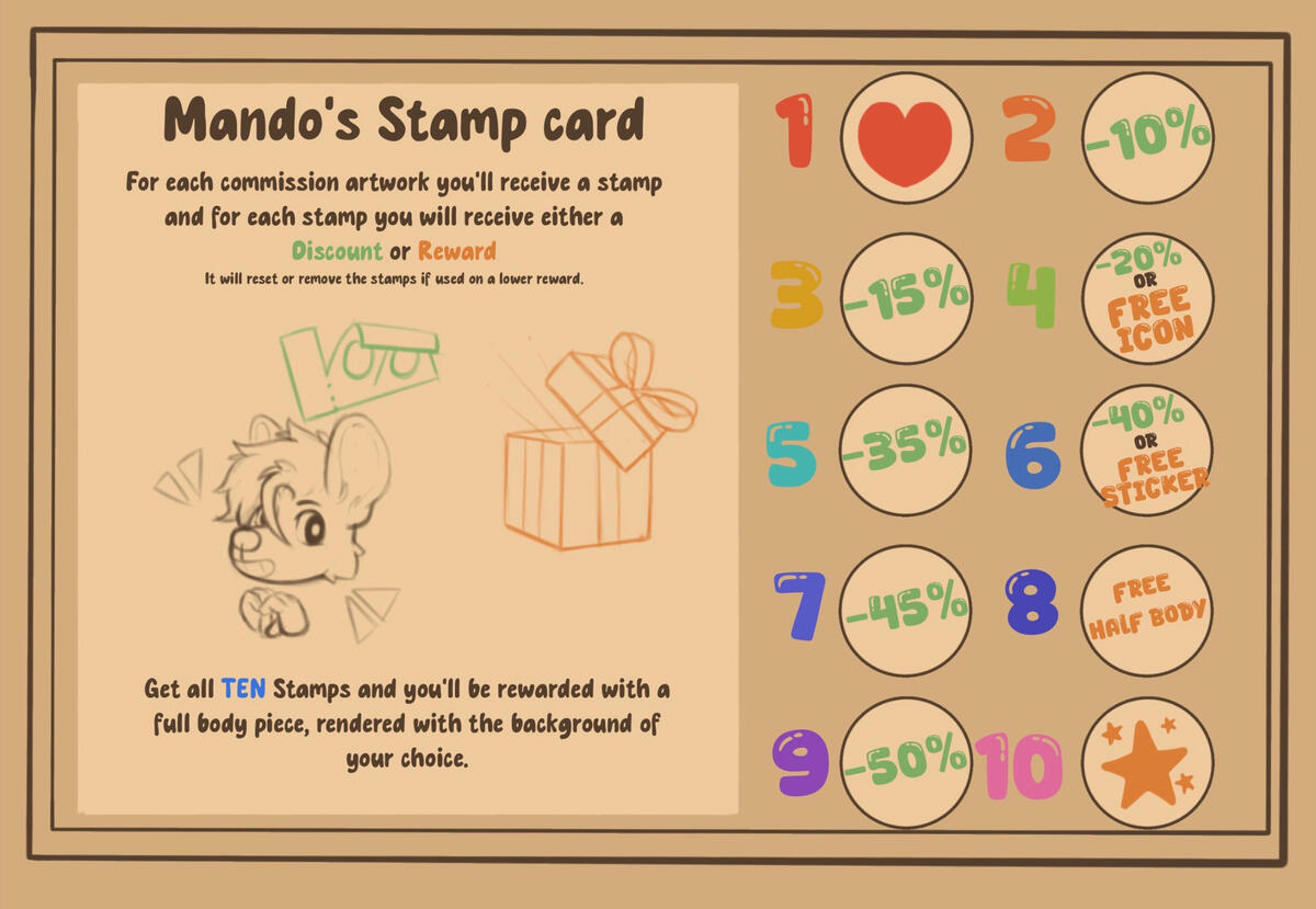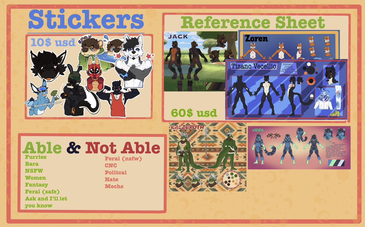 You are customizing your own layout and template have it ready; made it yourself or referencing another. You are allowed one free Alt it can include clothing or nsfw (only 18+). You may include information in your ref sheet. It is highly customizable to your needs.Front, back, and side pose, but if you want just 3/4 angle of the front and back that will be fine too. You do get to have a chibi form of your character. You can request upward to 4 expressions only but if you want less that’s fine. You can add as many accessories around the piece you want; this includes close ups of certain things you want highlighted in your character like a tattoo, eye shape, paws, maws, genitalia, etcPlease don’t leave any detail missing. lack of information of what you want will result in me not accepting on doing your reference sheet. These include layout of reference sheet, uncertainty how the character looks, lack of communication.Reference Sheet: 60USDSTICKERSStickers/ Emotes are small or big icons used for messages, texts, physical stickers, and expressions. Currently they are custom sticker designs that you get to decide how I make them. I will be adding a sticker catalogue soon. No full bodies unless simplified chibi. Only head, half body, and simplified designs are available for these. Limited to 5 per slot