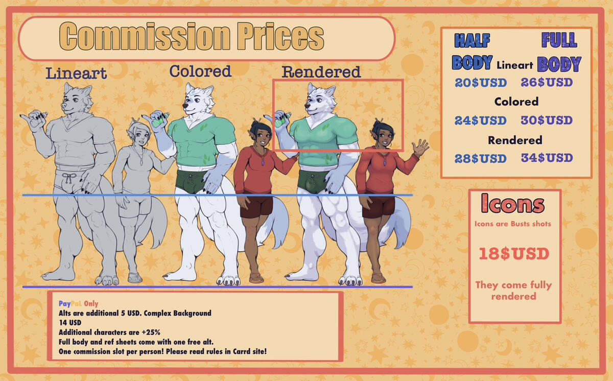 Prices are:lineart: 26USDflat colors: 30USDrendered:34USD